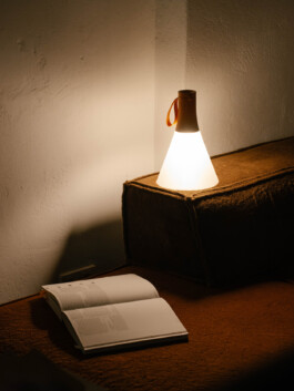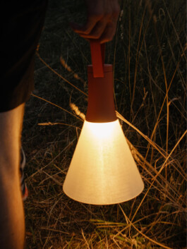 Vespertine combines the archetype of the familiar ceiling lamp with mobile lighting technology, featuring a ribbon for flexible hanging possibilities and a shade that acts as a diffuser for the pendant light and becomes a stand when the luminaire is used as an ambient or table lamp. Designed for an active lifestyle, it is rugged, weatherproof and has a battery life of up to 12 hours. The body also features a USB-C charging port for independent charging on the go.
